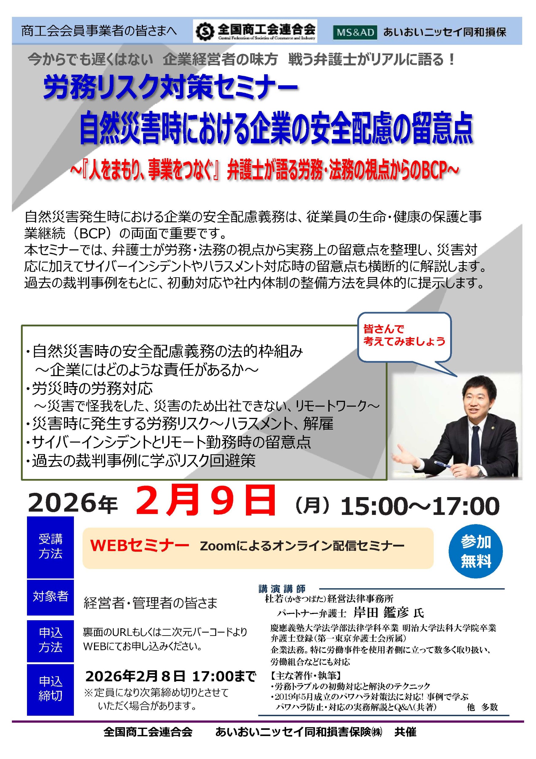 労務リスク対策セミナー 自然災害時における企業の安全配慮の留意点~『人をまもり、事業をつなぐ』弁護士が語る労務・法務の視点からのBCP~ が開催されます