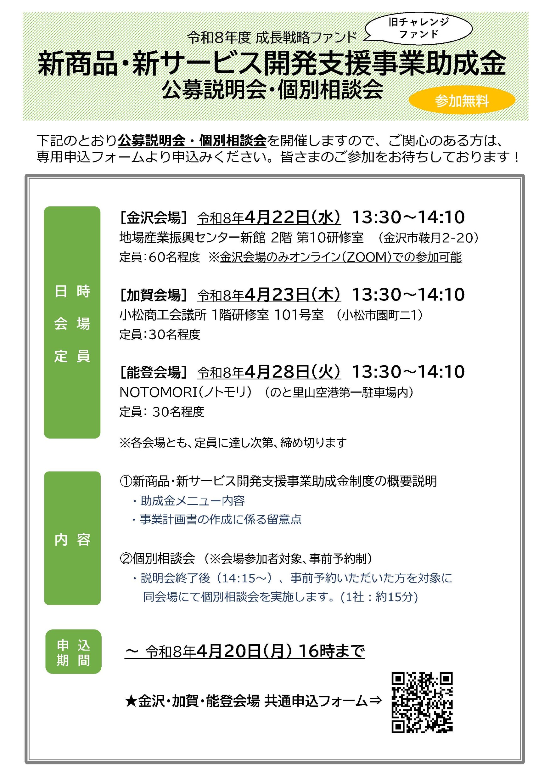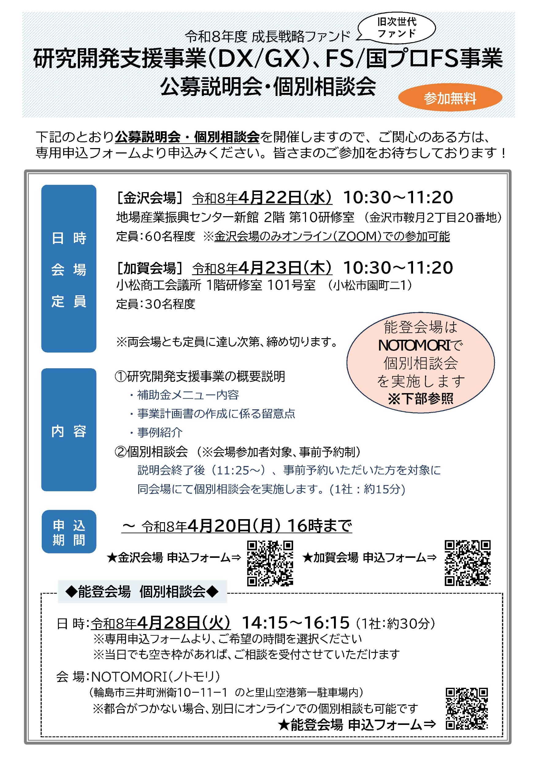R8年度は下記日程で公募説明会を実施いたしますので、関係者の皆様、研究開発・商品開発等に取り組まれる中小企業者等の皆様へ周知いただき、ご活用いただけましたら幸いです。