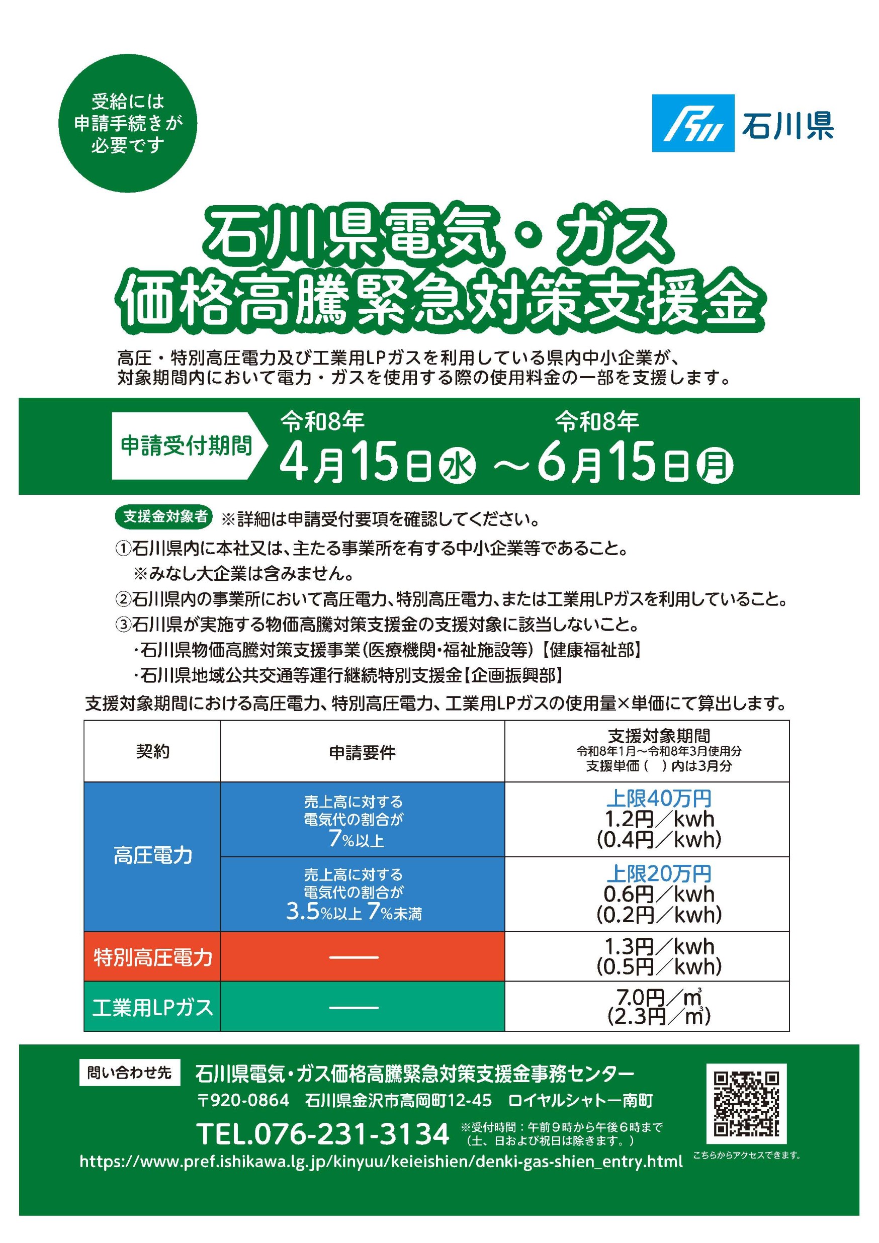 ---------- 申請受付期間:  令和8年4月15日(水)~6月15日(月) 高圧電力: 売上に対する電気代7%以上:1.2円/kwh(0.4円/kwh) 【上限40万円】 売上に対する電気代3.5%以上7%未満:0.6円/kwh(0.2円/kwh) 【上限20万円】 特別高圧:  1.3円/kwh(0.5円/kwh) 工業用LP:  7.0円/㎥(2.3円/㎥)  ※令和8年1~3月使用分が対象。()カッコ内は3月分支援単価 お問い合わせ先:  石川県電気・ガス価格高騰緊急対策支援金事務センター  076-231-3134(平日9時~18時) ----------